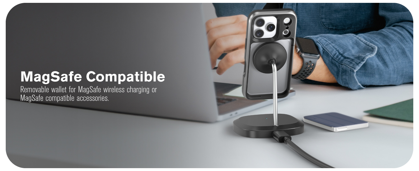 Removing the MagSafe mounted wallet from the case gives you access to your phones MagSafe functionality. This design allows you to continue to use your MagSafe accessories without removing the whole phone from the case.