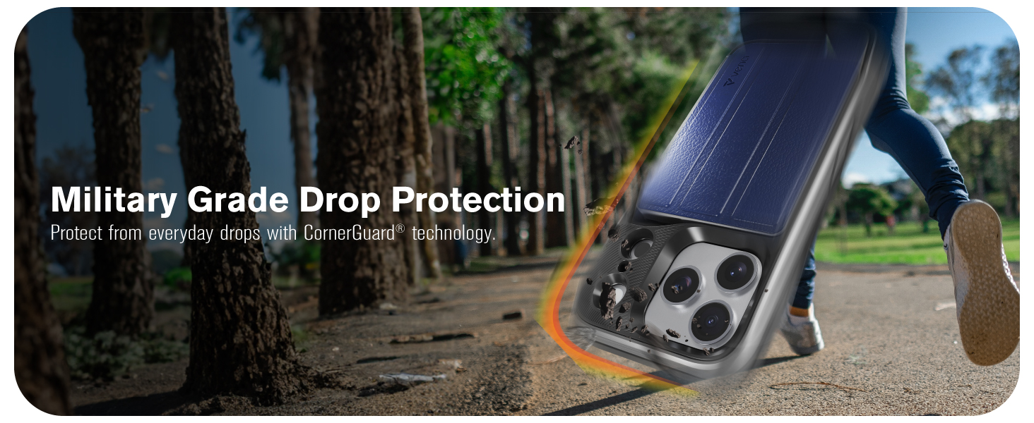 Made from premium polycarbonate (PC) and shock-absorbing thermoplastic polyurethane (TPU), this case with removable MagSafe compatible wallet has been drop tested to exceed MIL-STD 810G-516.6, surviving 26 drops from 8 feet high. With CornerGuard® technology, it disperses the force from shock and impact throughout the case.